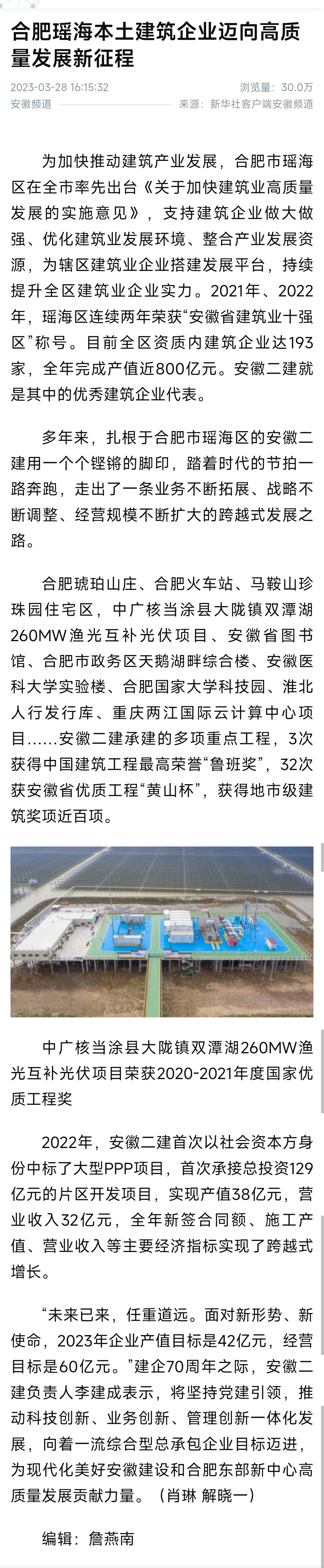 時(shí)光向前,二建向上!3月28日,自人民網(wǎng)、央廣網(wǎng)、中國(guó)網(wǎng)、中國(guó)日?qǐng)?bào)網(wǎng)、安徽日?qǐng)?bào)客戶(hù)端等主流媒體集中報(bào)道安徽二建七十年發(fā)展成就后,公司作為合肥瑤海本土優(yōu)秀建筑企業(yè)邁向高質(zhì)量發(fā)展新征程,首次刊登在新華社客戶(hù)端安徽頻道,一經(jīng)報(bào)道瀏覽量達(dá)30萬(wàn)次。