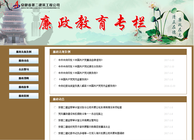 該專欄以公司網(wǎng)站為依托,設(shè)有廉政法規(guī)條例、廉政動態(tài)、名言警句、廉政漫畫、廉政故事、廉政案例六大板塊。通過廉政法規(guī)條例,轉(zhuǎn)載《中國共產(chǎn)黨廉潔自律準則》、《中國共產(chǎn)黨紀律處分條例》、《中國共產(chǎn)黨問責(zé)條例》、《安徽省預(yù)防職務(wù)犯罪條例》等一系列黨紀黨規(guī)、國家法律法規(guī)知識,并在每一次修訂后及時更新,為廣大黨員干部學(xué)習(xí)使用提供方便。運用廉政動態(tài),及時發(fā)布集團紀委和公司黨委、紀委通知要求,通報監(jiān)察審計事項與結(jié)果,做到監(jiān)督的公開化、透明化。以名言警句、廉政漫畫、廉政故事、廉政案例感染人、陶冶人,內(nèi)容直觀形象,用勤廉典型激勵人,深入剖析典型違紀案例,加強警示教育。
