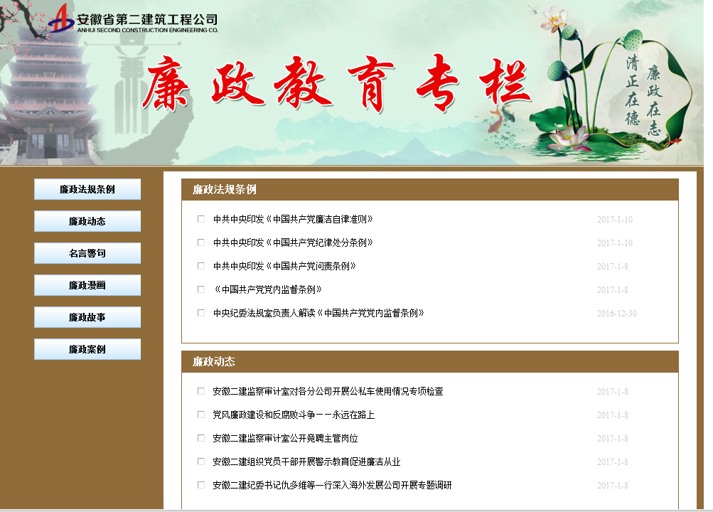 為實現(xiàn)廉政教育工作日?;討B(tài)化,同時結合省國資委、集團紀委工作要求,經(jīng)過前期的創(chuàng)意和材料收集,在信息部的大力支持下,公司紀委《廉政教育專欄》于2017年1月10日正式上線。