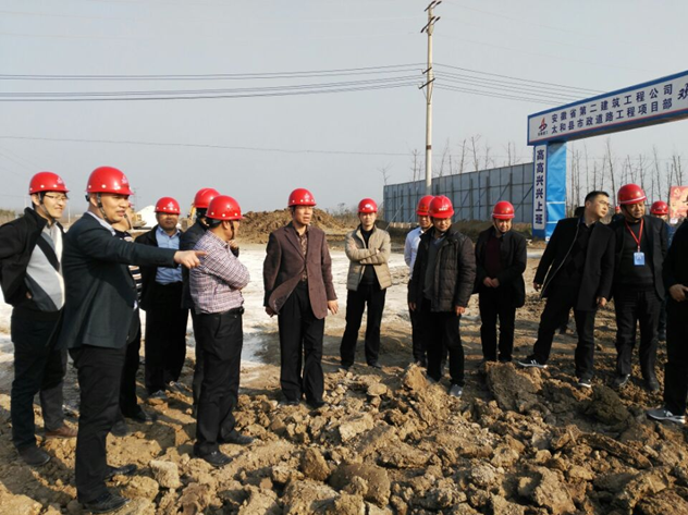 2017年2月15日,集團(tuán)公司黨委委員、副總經(jīng)理王厚良、總經(jīng)理助理、工程管理部主任童宗勝、安全監(jiān)察局主任殷博、投資公司總經(jīng)理朱忠明等一行赴安徽二建承建的太和縣經(jīng)開區(qū)現(xiàn)代醫(yī)藥產(chǎn)業(yè)及發(fā)藝產(chǎn)業(yè)基礎(chǔ)配套工程PPP項目工程施工現(xiàn)場檢查指導(dǎo)工作。