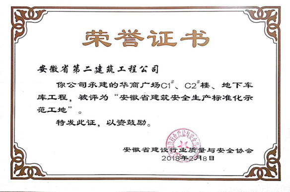 由三分公司承建的華商廣場C1、C2#樓、地下車庫項目與2018年2月8日正式被安徽省建設(shè)行業(yè)質(zhì)量與安全協(xié)會評為“安徽省建筑安全生產(chǎn)標準化示范工地”稱號,近日正式授牌。