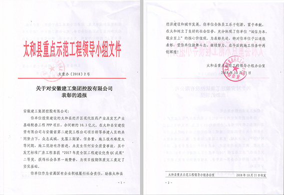 經(jīng)過兩年的“浴血奮戰(zhàn)”,2018年9月30日,太和PPP項目完成交工驗收工作,項目建設(shè)圓滿收官,并受到太和縣人民政府及太和縣重點示范工程領(lǐng)導小組辦公室的一致表彰,為公司品牌宣傳,形象提升做出積極努力,為“打造一流安徽建工”添磚加瓦。