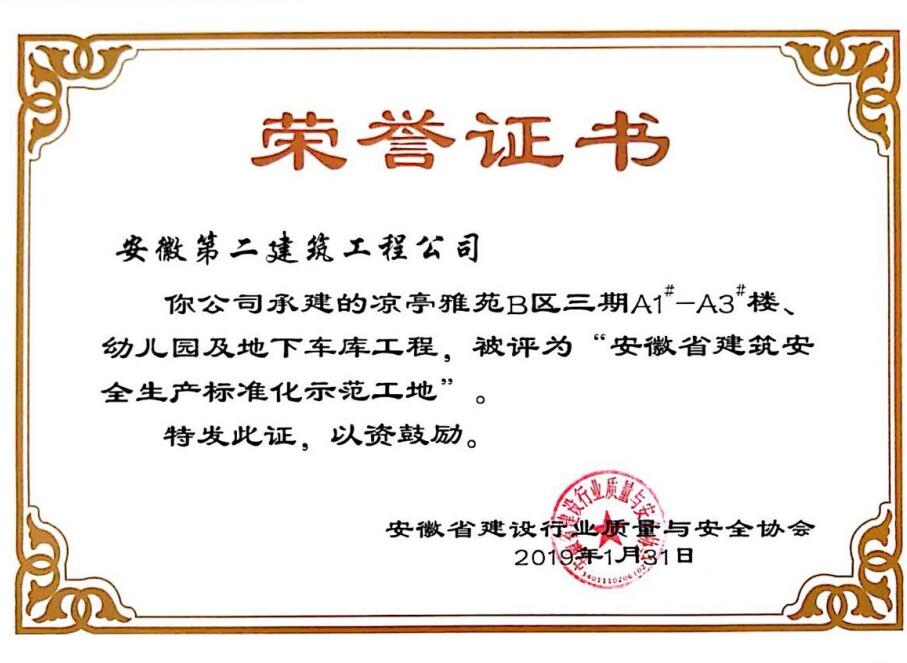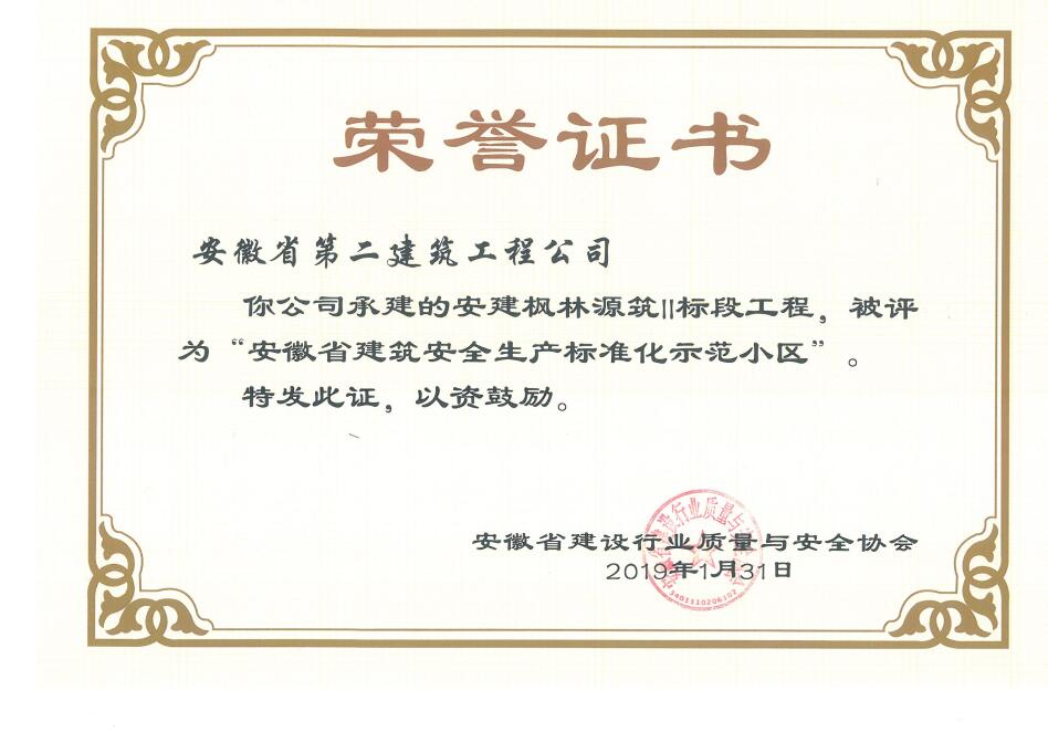 近日,從安徽省建設(shè)行業(yè)質(zhì)量與安全協(xié)會獲悉,安徽二建承建的肥西涼亭雅苑、阜陽楓林源筑、阜陽廣元大學(xué)城、宿州恒馨印象、淮北東岳雅苑5個項(xiàng)目獲得2018年度“安徽省建筑施工安全生產(chǎn)標(biāo)準(zhǔn)化示范工地”稱號,為公司再添榮譽(yù)。