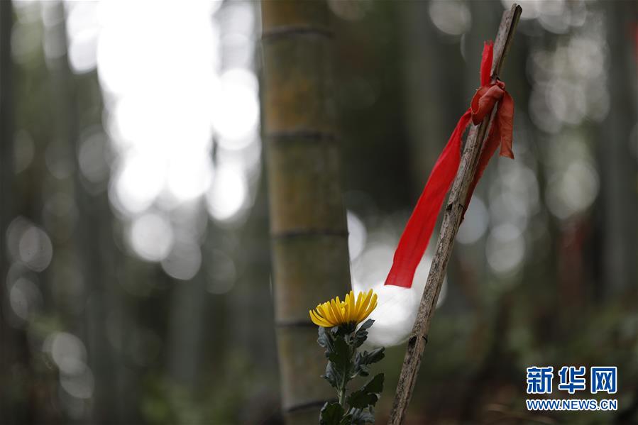 福建武夷山洋莊鄉(xiāng)小漿村張山頭紅軍墓冢上的編號和紅飄帶(3月25日攝)。新華社記者劉芳攝