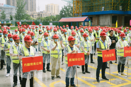 6月18日上午,安徽二建公司“戰(zhàn)疫情、搶工期、保目標(biāo)、促超產(chǎn)”勞動(dòng)競賽啟動(dòng)儀式在淮北國金華府(紫麟苑)項(xiàng)目現(xiàn)場舉行?;幢笔凶〗ň痔瞥蔂I處長、副處長張喜明、質(zhì)監(jiān)站徐棟副站長、淮北市相山區(qū)住建局呂鵬宇局長、淮北國金置業(yè)有限公司董事長許偉應(yīng)邀出席儀式。公司領(lǐng)導(dǎo)班子成員、機(jī)關(guān)相關(guān)部門人員及所屬各單位主要領(lǐng)導(dǎo)、分管安全領(lǐng)導(dǎo)等共計(jì)150余人參加活動(dòng),工會(huì)女工主任王俊主持啟動(dòng)儀式。