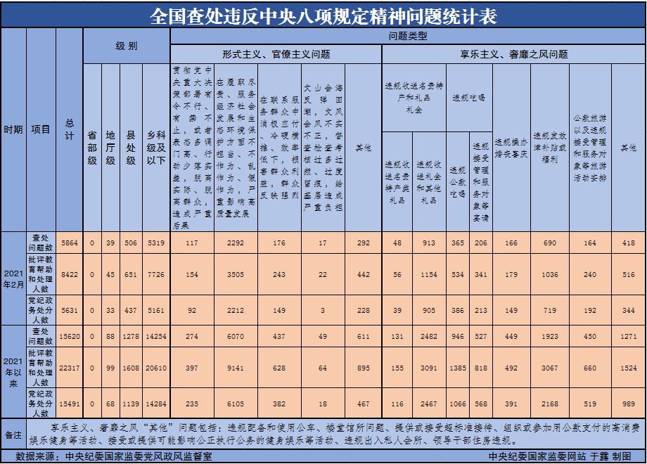 3月29日,中央紀(jì)委國家監(jiān)委公布了2021年2月全國查處違反中央八項規(guī)定精神問題匯總情況。當(dāng)月,全國各級紀(jì)檢監(jiān)察機(jī)關(guān)共查處違反中央八項規(guī)定精神問題5864起,批評教育幫助和處理8422人,其中黨紀(jì)政務(wù)處分5631人。