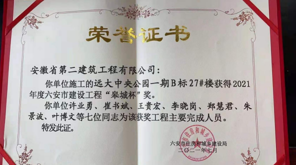 近期,六安市住房和城鄉(xiāng)建設局公布了2021年度六安市建設工程“皋城杯”獲獎項目名單,其中由安徽二建公司承建的舒城遠大項目獲此獎項。