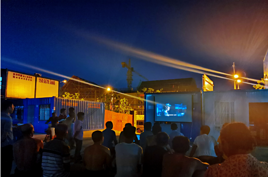 夜幕降臨,放映場(chǎng)上,辛勤勞作一天的工人們聚在一起,平時(shí)忙碌的工作,以及住宿條件的限制,每天的“兩點(diǎn)一線”讓他們的業(yè)余生活枯燥而單調(diào),沒有那么豐富,通過在工人生活區(qū)放映電影,讓他們的業(yè)余生活多了一項(xiàng)文化娛樂項(xiàng)目,可以給他們帶來一場(chǎng)文化盛宴。
