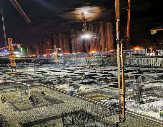 施工進(jìn)入白熱化階段,遇到材料短缺、勞務(wù)班組緊張等困難,分公司領(lǐng)導(dǎo)更高度重視,組建了由各個科室負(fù)責(zé)人參加的“重點(diǎn)項目工作協(xié)調(diào)QQ群”,把項目遇到的難題及時反饋并予以解決,分公司經(jīng)理馬福才、支部書記陳習(xí)武更是經(jīng)常駐扎現(xiàn)場,解決勞務(wù)外援、協(xié)調(diào)處理大宗主材進(jìn)場等問題。在每日召開的生產(chǎn)調(diào)度會上,項目經(jīng)理汪傳松多次強(qiáng)調(diào),要超前謀劃,科學(xué)組織,大膽管理,各勞務(wù)班組根據(jù)現(xiàn)有工作面盡快增加班組和一線作業(yè)工人,上足人員;項目部要合理配置人力、物力、塔吊等垂直運(yùn)輸設(shè)備,安排好工序銜接,實(shí)現(xiàn)晝夜不間斷施工,同時要確保“大干大安全、小干有安全”,針對業(yè)主6月20日提出正負(fù)零節(jié)點(diǎn)計劃,項目部制定了四點(diǎn)措施:一是分解目標(biāo),細(xì)化責(zé)任,日排計劃,要求現(xiàn)場施工人員根據(jù)圖紙認(rèn)真梳理計算各標(biāo)段工程量,詳細(xì)分解施工任務(wù);二是明確現(xiàn)場責(zé)任分工,加大管理力度,督促現(xiàn)場盯控力度,保障工程質(zhì)量;三是加大協(xié)調(diào)力度,優(yōu)化資源,整合機(jī)械設(shè)備發(fā)揮最大的生產(chǎn)力;四是加強(qiáng)與勞務(wù)班組負(fù)責(zé)人的溝通,明確節(jié)點(diǎn)任務(wù),輸貫信念,激發(fā)工人潛力,提高工作效率。全體人員要同心協(xié)力,充分發(fā)揮團(tuán)結(jié)奮進(jìn)精神,要見縫插針,穿插作業(yè),要有“搶晴天戰(zhàn)雨天,白天晚上加班干”的精神,強(qiáng)勢推進(jìn)施工進(jìn)度。從5月12日到5月25日已完成產(chǎn)值2300萬,創(chuàng)安徽二建公司月產(chǎn)值歷史新高;截至目前,鋼筋用量1700噸;混凝土用量11000方,平均每日混凝土澆筑量550方。