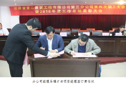 在分公司職工大會(huì)上,分公司經(jīng)理馬福才與參賽的各項(xiàng)目經(jīng)理簽訂了勞動(dòng)競(jìng)賽責(zé)任狀。其中阜陽吾悅廣場(chǎng)項(xiàng)目為新城控股開發(fā),是分公司首次與上市地產(chǎn)公司合作,工期緊、任務(wù)重,項(xiàng)目經(jīng)理表示一定會(huì)不折不扣的完成勞動(dòng)競(jìng)賽責(zé)任狀的內(nèi)容,做到比、學(xué)、趕、幫、超,塑造二建良好形象。其他項(xiàng)目經(jīng)理也一致表示會(huì)認(rèn)真貫徹職代會(huì)精神,積極響應(yīng)勞動(dòng)競(jìng)賽號(hào)召,為完成公司年度指標(biāo)添磚加瓦,為黨的98歲華誕送上一份生日祝福。