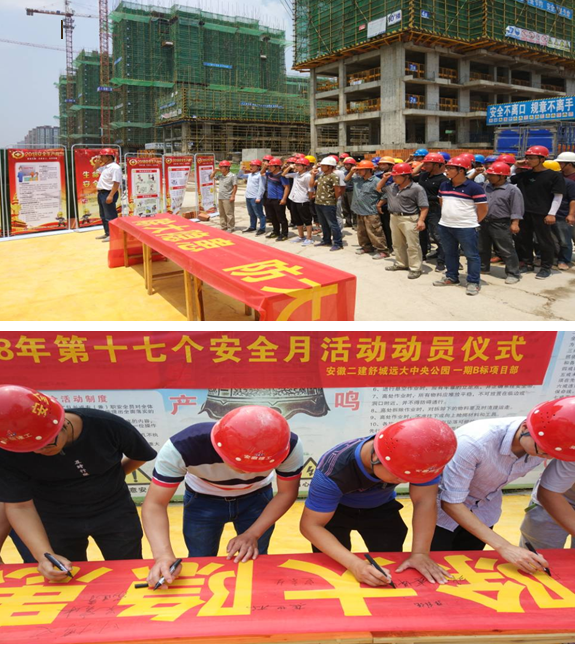 6月1日,舒城遠(yuǎn)大中央公園一期B標(biāo)段項(xiàng)目部響應(yīng)公司號(hào)召,組織開展2018年第十七個(gè)安全生產(chǎn)月活動(dòng),項(xiàng)目全體管理人員及勞務(wù)班組成員參加。