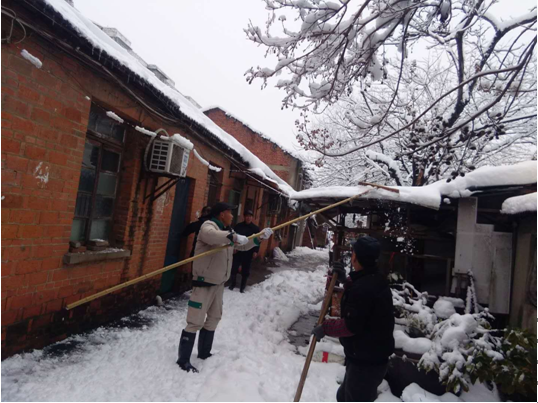 1月4日、5日,合肥地區(qū)普降暴雪,致使公司大院、分公司各生活基地多處老、舊平房100多戶遭受暴雪災(zāi)襲擊,造成樹枝斷裂壓在房頂上,危及職工住戶生命安全。路口路段出現(xiàn)大面積積雪堆積,交通堵塞,影響居民正常生活出行。面對緊急災(zāi)情,后勤綜合服務(wù)部一是立即成立了除雪保暢、維修應(yīng)急處置小分隊,合理分工,各負(fù)其責(zé)。分赴公司大院、二、四分公司生活基地,冒著雨雪搶修高壓電網(wǎng)短路、水管爆裂等災(zāi)情;二是安排人員張?zhí)┭┨鞖庾龊美吓f房屋、人身安全緊急通知的告示,防患于未然,安全為天;三是與安裝分公司協(xié)助,抽調(diào)專業(yè)電工人員幫助消除電網(wǎng)隱患,確保住戶用電安全;四是針對公司大院31棟北側(cè)一棵高13米,直徑0.7米的大樹被雪壓倒塌,造成一墻之隔的安紡2村住宅樓第二單元部分損壞和居住安全隱患,后勤及時聯(lián)系專業(yè)樹木砍伐隊伍,對樹木進(jìn)行分段切割,消除了倒塌樹木對住戶造成的安全隱患,確保了住戶的人身和財產(chǎn)安全。