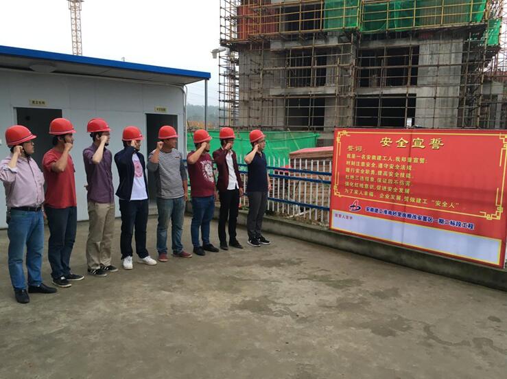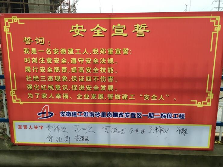 早上六點,清晨第一縷陽光剛剛灑下,項目部管理人員已在安全宣誓牌前排列整齊,面對莊嚴的宣誓牌,全體成員在項目技術負責人王歡的帶領下,右手握拳置于面龐,鄭重地齊聲宣讀誓詞:我是一名安徽建工人,我鄭重宣誓:時刻注意安全,遵守安全法規(guī);履行安全職責,提高安全技能;杜絕三違現(xiàn)象,保證四不傷害;強化紅線意識,促進安全發(fā)展;為了家人幸福,企業(yè)發(fā)展,誓做建工“安全人”。隨后,項目部全體成員在項目經(jīng)理費祥琪的帶領下,陸續(xù)在宣誓牌上簽下了自己的名字,表明自己時刻謹記安全宣誓內(nèi)容,堅持安全生產(chǎn)的決心。