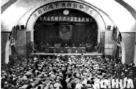 4月23日,在延安楊家?guī)X中央大禮堂,七大開幕式的主席臺上,懸掛著毛澤東和朱德的巨幅畫像,鮮艷的黨旗掛在兩邊。會場后面的墻上,掛著“同心同德”四個大字。兩側(cè)墻上張貼著“堅持真理”“修正錯誤”等標語,靠墻邊插著24面紅旗,象征著中國共產(chǎn)黨24年奮斗的歷程。插紅旗的“V”字形木座是革命勝利的標志。在主席臺的正上方,懸掛著一條引人注目的橫幅:“在毛澤東的旗幟下勝利前進!”