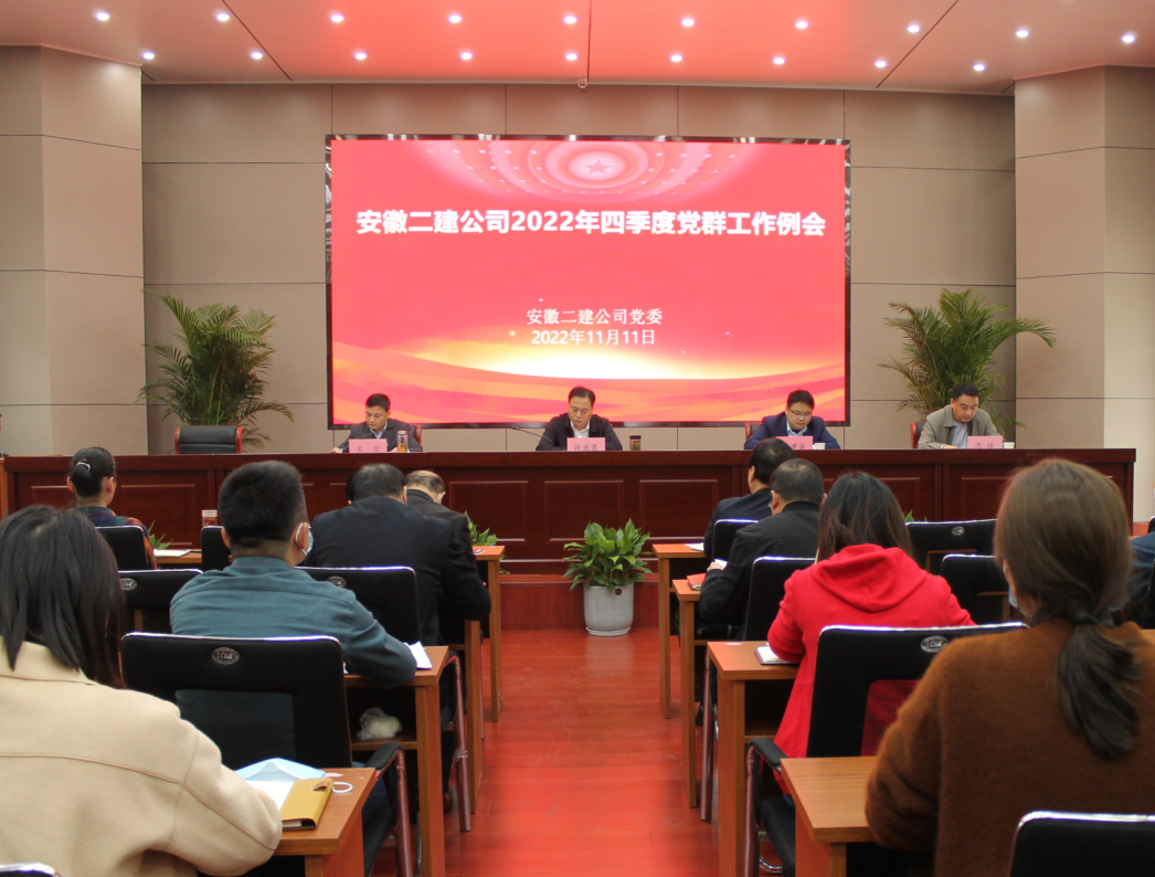 11月11日上午,安徽二建公司召開(kāi)2022年四季度黨群工作例會(huì)。黨委書(shū)記、董事長(zhǎng)許業(yè)勇出席會(huì)議并講話(huà),公司領(lǐng)導(dǎo)李建成、王軍、沈壯出席會(huì)議,黨群部門(mén)人員、所屬各單位黨支部書(shū)記、工會(huì)主席、團(tuán)支部書(shū)記、綜合辦負(fù)責(zé)黨務(wù)工作人員參會(huì)。會(huì)議由王軍主持。